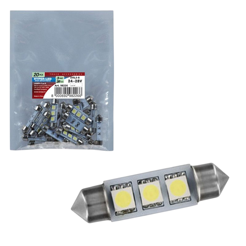 LAMPARA HYPER LED 10X39 MM BLANCO 24/28V 3SMD 3 CHIP SV8,5-8 (BOLSA 20 UNIDADES)