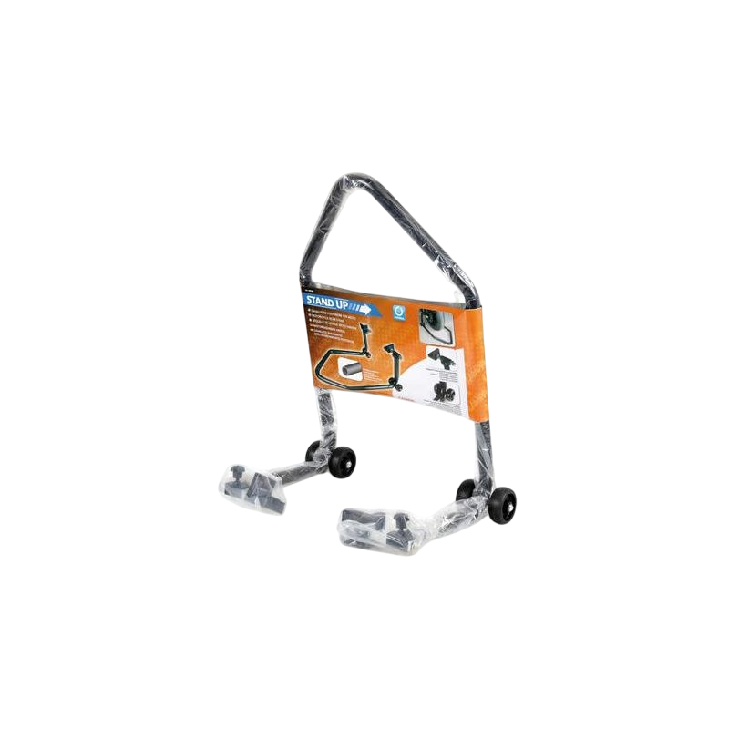 Caballete trasero Faseba 8000692900185 para motocicletas con basculante convencional. Estructura robusta, ruedas de goma y diseño desmontable para fácil almacenamiento.