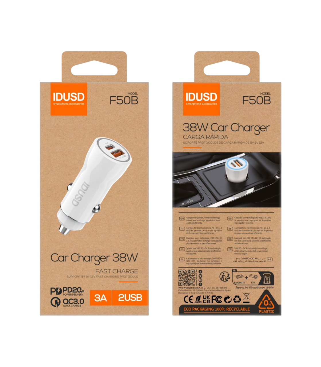 El Cargador de Coche PD+QC 38W (Ref: F50B) es la solución ideal para conductores que buscan una carga rápida, eficiente y segura en sus desplazamientos. Gracias a su puerto USB-C PD de 20W y USB-A QC de 18W, este cargador permite recargar simultáneamente hasta dos dispositivos con una potencia máxima de 38W, asegurando que smartphones, tablets y otros equipos estén siempre listos para su uso.