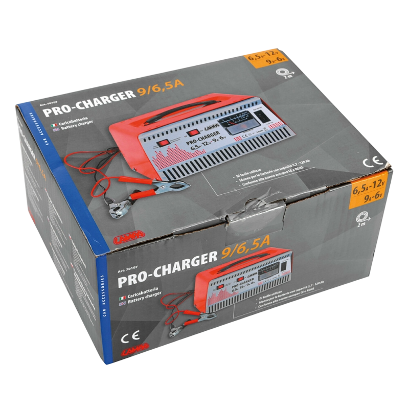 Robusta carcasa de metal con asa de transporte. Aislamiento protecto.r Protección automática contra polaridad inversa, cortocircuito y sobrecarga. Amperímetro, cable de alimentación de 2 metros y 230 V, cables de carga de 1,2 metros con terminales. Aprobado y cumple con los estándares europeos. Homologación GS-TÜV.