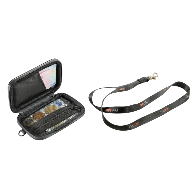 Característica Detalles Dimensiones (ext/int) 120×80×20 mm / 110×70×10 mm Protección Cierre y revestimiento impermeables Accesorios Gancho seguridad + cordón para colgar al cuello Compatibilidad Compatible con sistema Opti-Line Duolock Uso recomendado Documento, dinero, tarjetas; ideal para motoristas y ciclistas