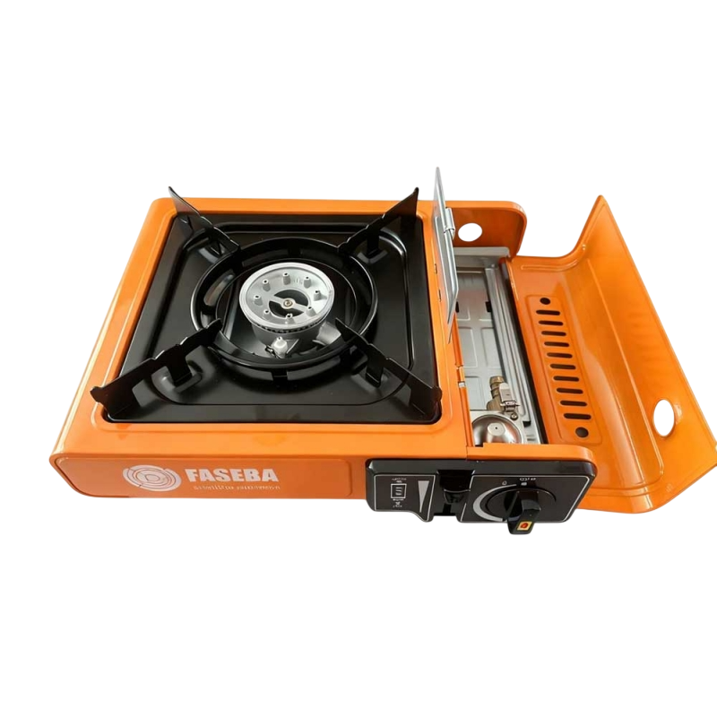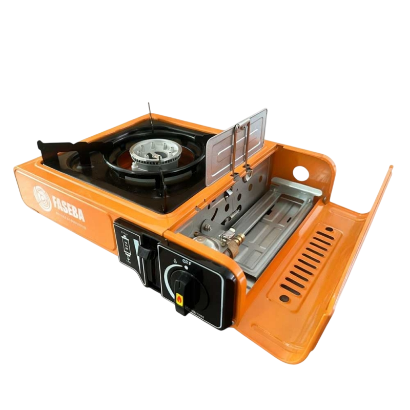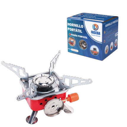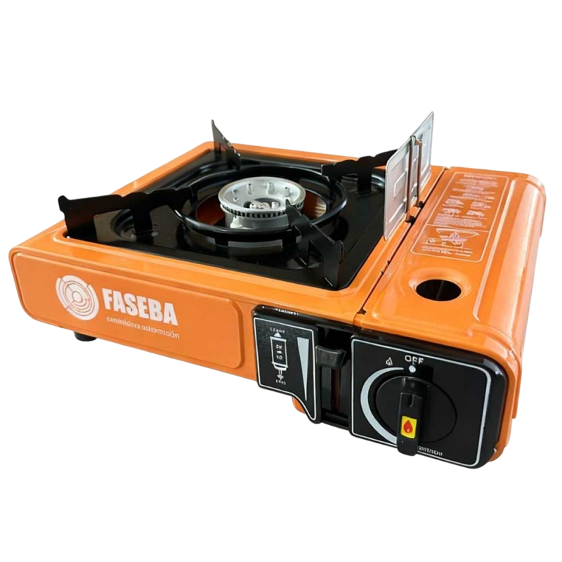 Cocina de gas portátil Faseba homologada con adaptador para bombonas de butano y propano. Diseño resistente y funcional para cocinar en exteriores con total seguridad.