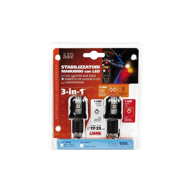 Característica Detalles Funciones LED Posición delantera (blanca), trasera (roja), intermitentes (naranja) Reducción vibraciones Sí, mejora el confort de conducción Compatibilidad Manillares de 17 a 23 mm de diámetro Homologación Intermitentes sí; luces de posición no