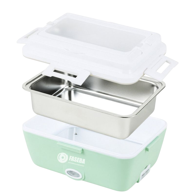Fiambrera eléctrica Faseba (1,8 L) con bandeja extraíble y cubiertos de acero inoxidable. Funciona a 12/24 V, con cable de 80 cm. Compacta y perfecta para comidas calientes en ruta.