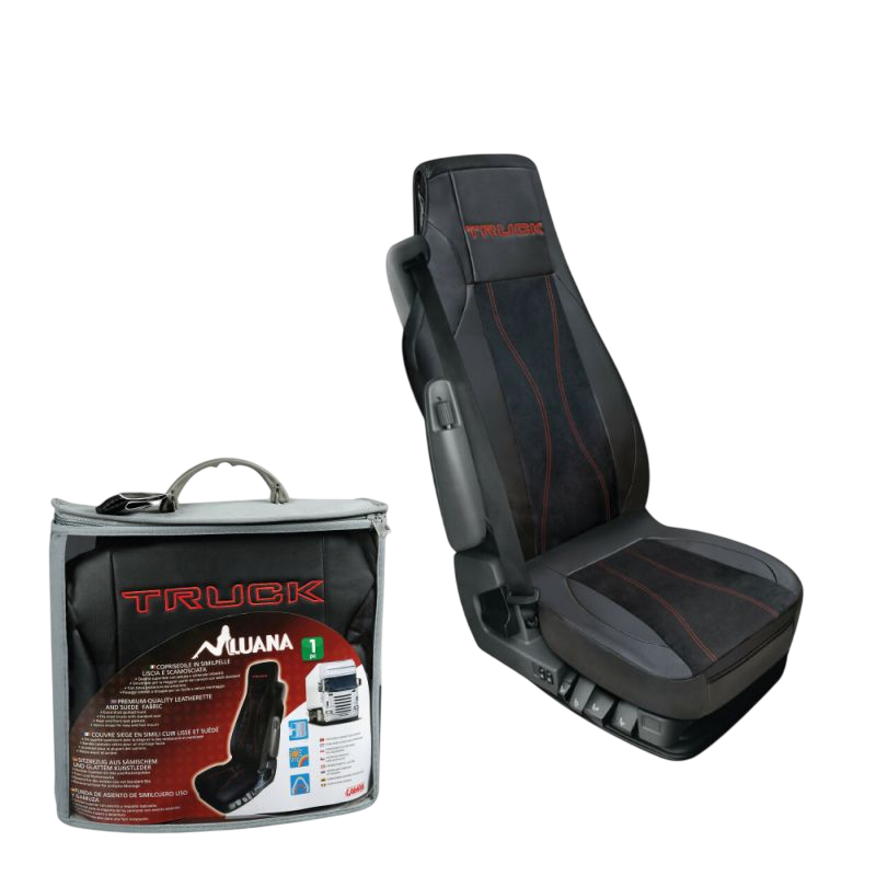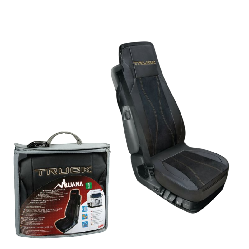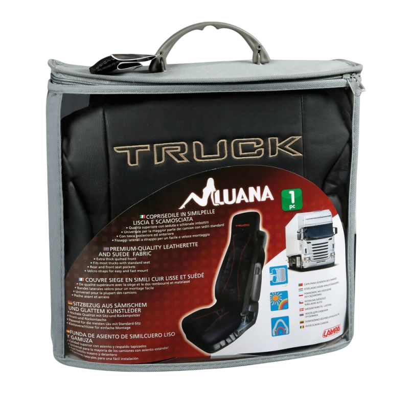 Funda de asiento “Luana” para camión, en cuero sintético de alta calidad. Incluye acolchado completo, bolsillo delantero y trasero, y fijaciones laterales con velcro para montaje universal.