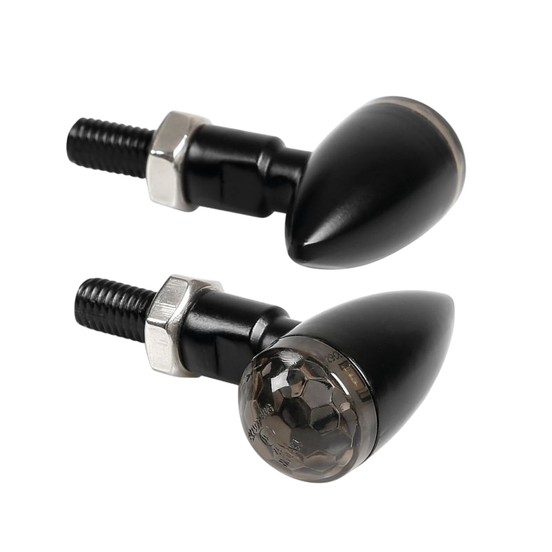 Intermitente LED negro 12 V con lente ahumada, luz naranja, plug-and-play, resistente a vibraciones y acabado elegante.