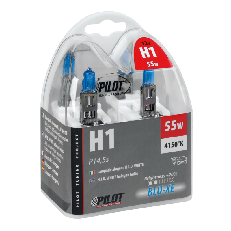 Pack de 2 Lámparas H1 Blue-XE 12 V 55 W. Luz ultra blanca tipo xenón, hasta 20 % más brillo que halógenas estándar. Base P14.5 s. Instalación rápida y eficiente.