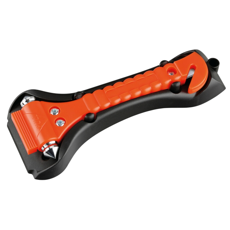 Herramienta de emergencia con punta de acero y cuchilla cortacinturón. Compacta, robusta y fácil de usar. Indispensable para tu seguridad en carretera.
