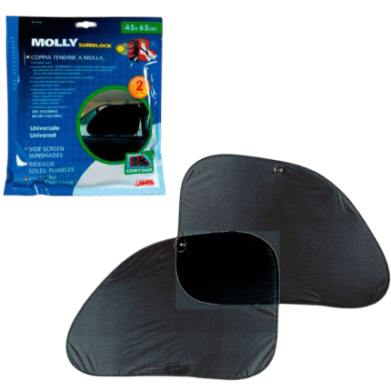 Este juego incluye dos parasoles laterales con forma trapezoidal, diseñados para encajar en ventanillas laterales delanteras. Fabricados en poliéster de doble capa, proporcionan sombra eficaz y protección contra rayos solares sin comprometer la visibilidad exterior. Además, su tejido simula una red de insectos, impidiendo la entrada de mosquitos o partículas cuando las ventanillas están bajadas.
