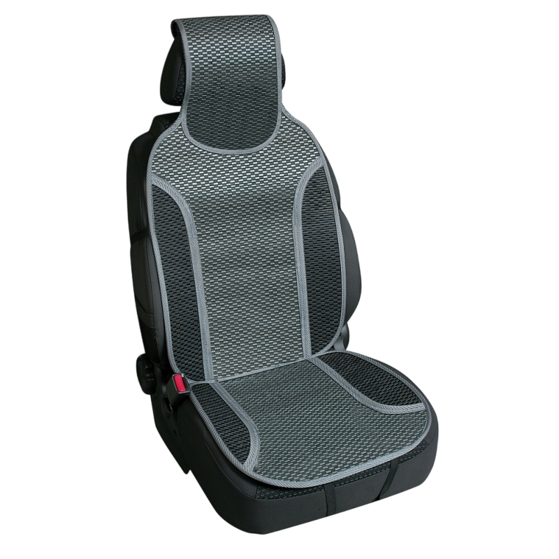 Respaldo de asiento verano en fibra de bambú natural, color gris. Diseño ventilado, ajuste universal con banda elástica, ideal para sofocar el calor y mejorar la postura al conducir.