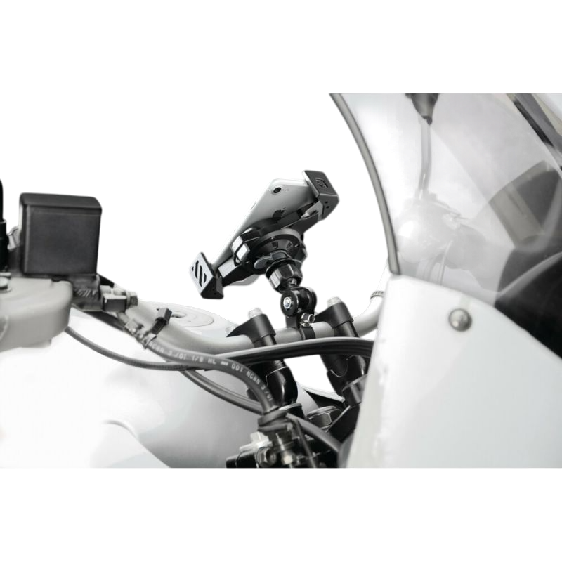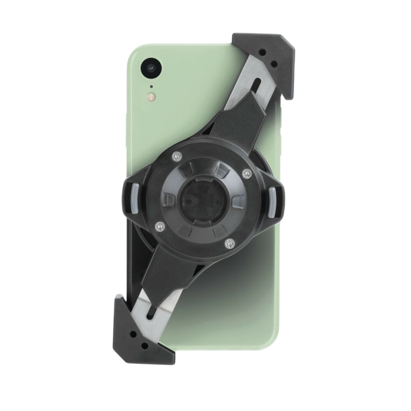 Robusto soporte metálico (aluminio y acero inoxidable), para móviles de 5,2″–7″. Incluye 4 adaptadores, ventilación, doble cierre y gancho de seguridad. Compatible con DuoLock.
